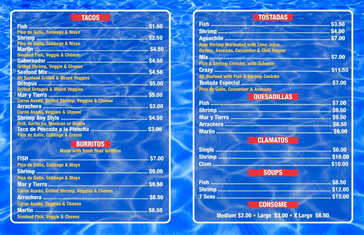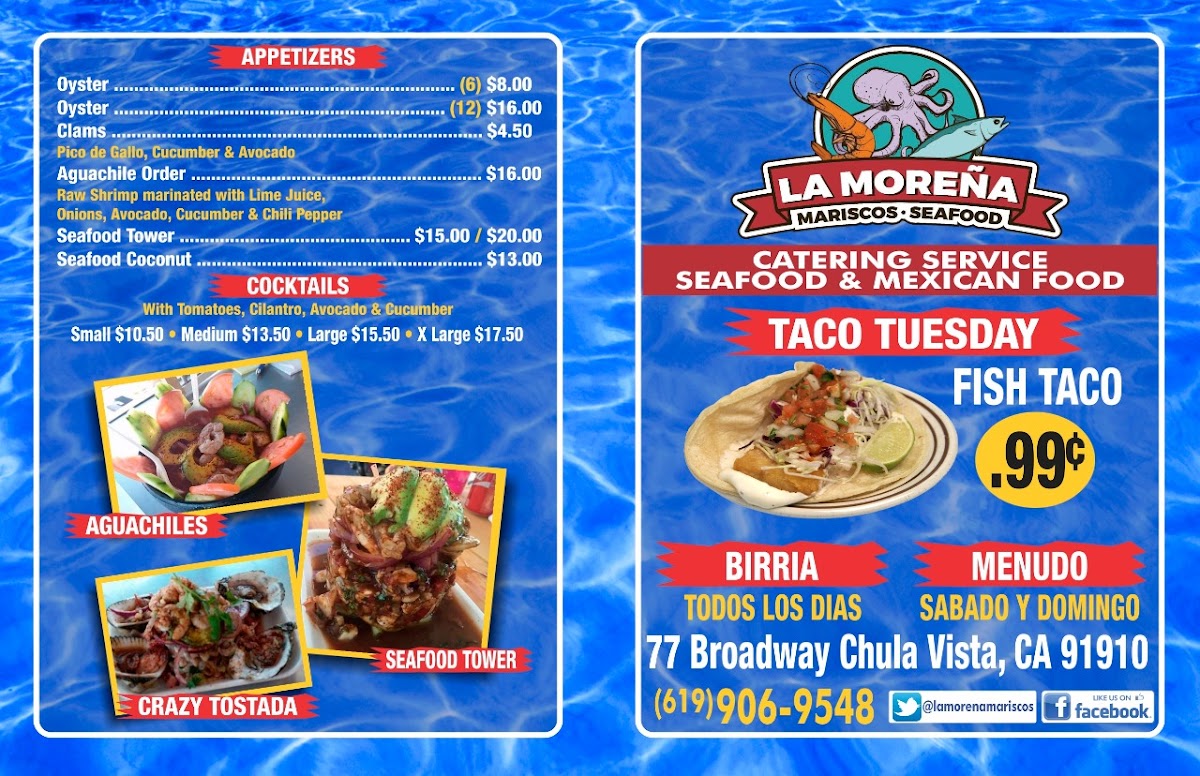 If you're in the mood for fresh, flavorful seafood, La Morena Mariscos Menu has exactly what you're looking for. Located at 77 Broadway in Chula Vista, CA, this spot brings a taste of coastal cuisine right to your table. From succulent shrimp and tender fish to rich, savory ceviches, each dish is packed with bold flavors that highlight the best of seafood. The menu is a celebration of mariscos, featuring traditional favorites like shrimp cocktails, fish tacos, and various marinated seafood specialties that are perfect for any craving. Whether you're grabbing a quick bite or enjoying a leisurely meal with friends, the vibrant, delicious options here promise to hit the spot every time. Don't forget to pair your meal with a refreshing drink from their selection for the ultimate dining experience!